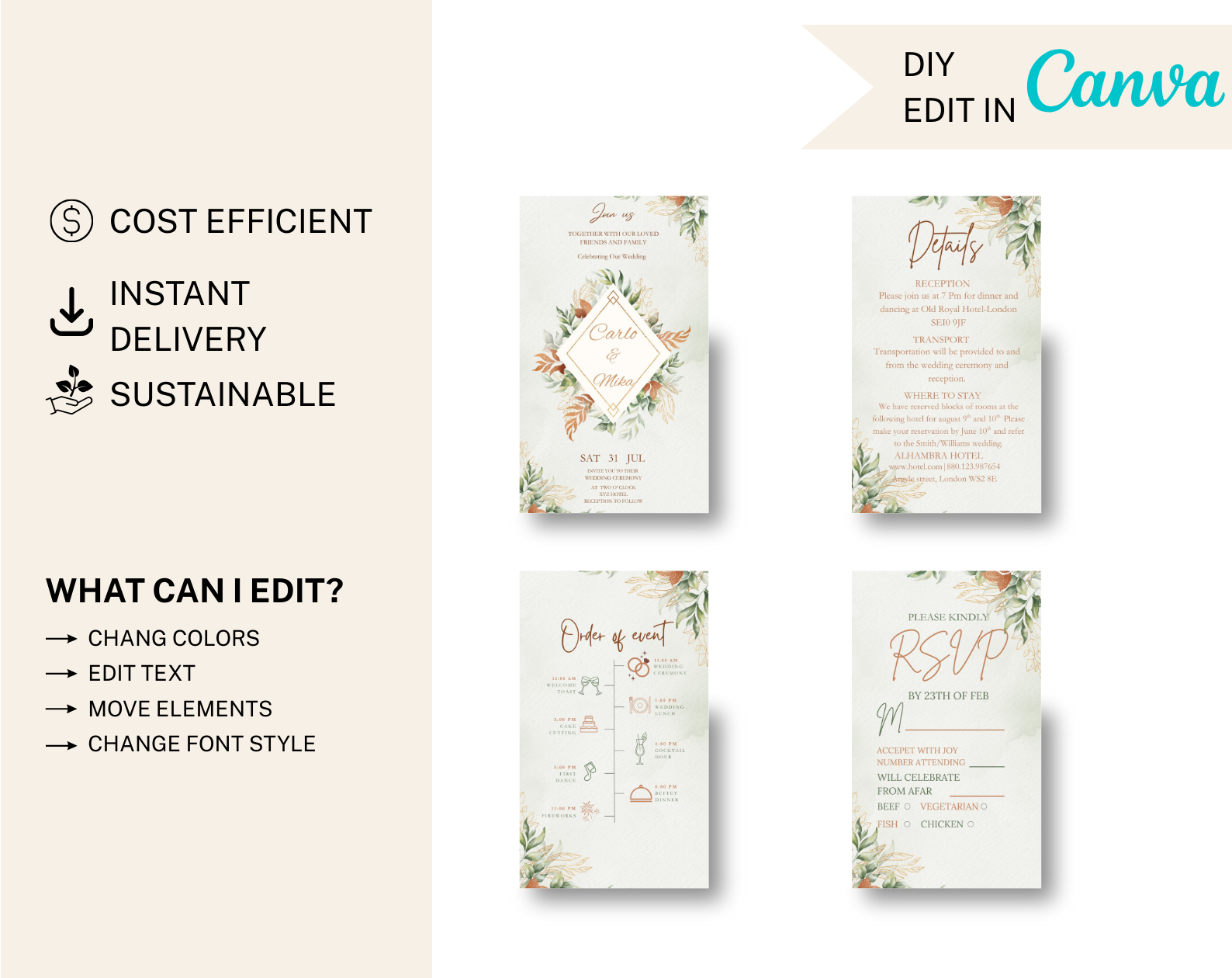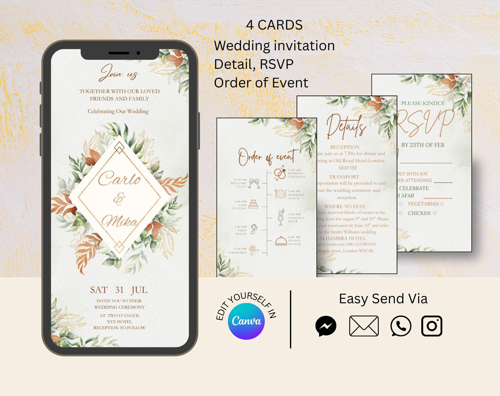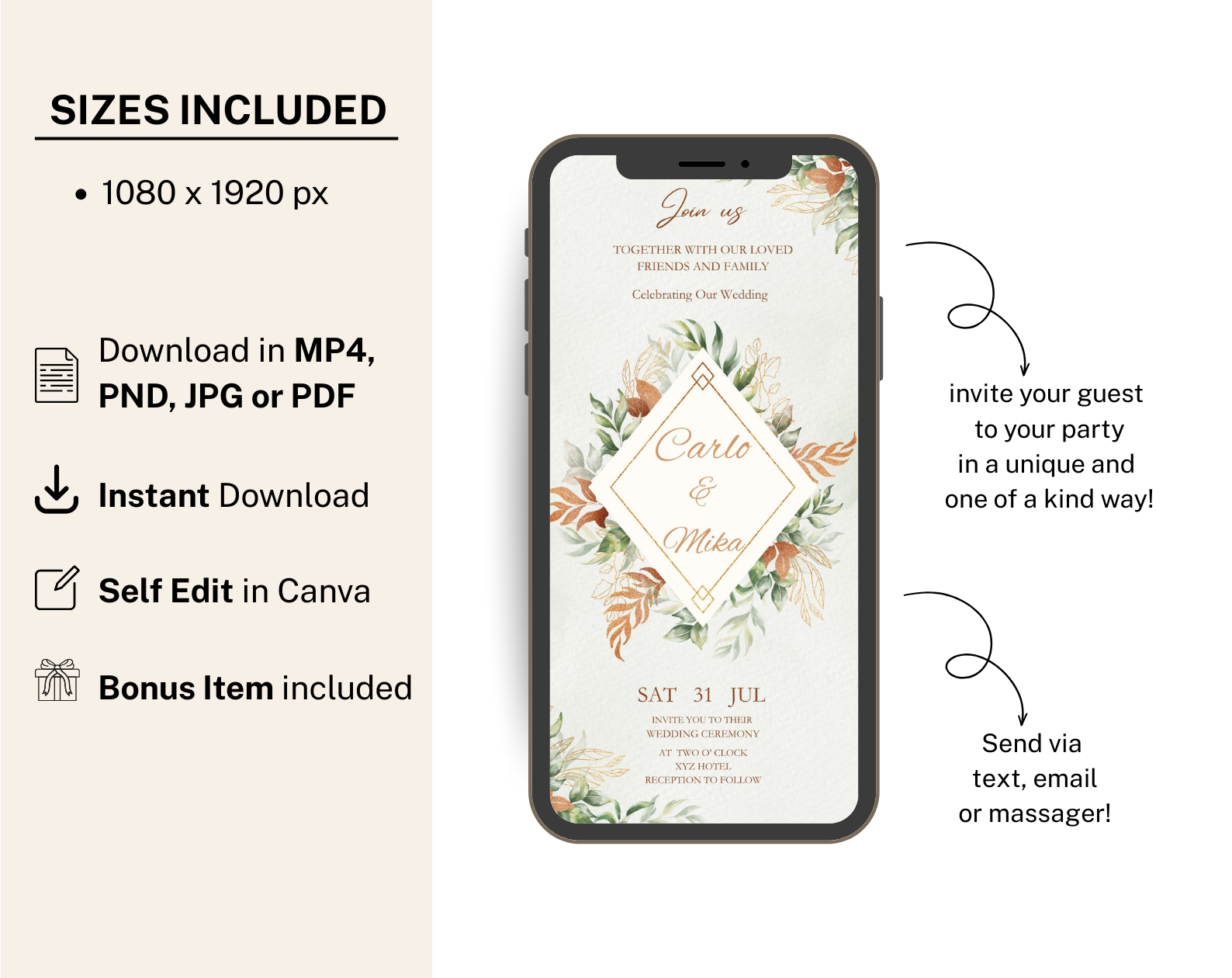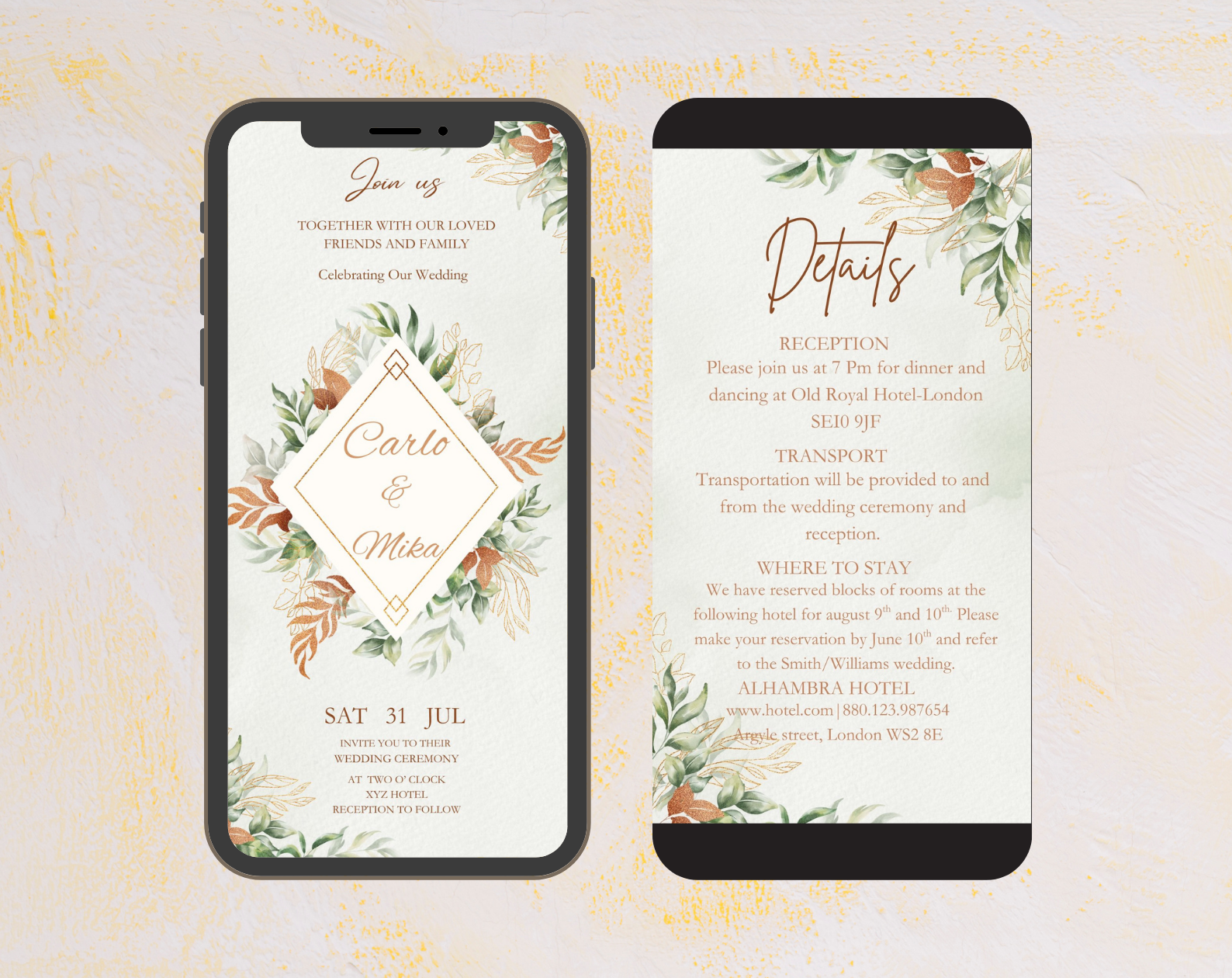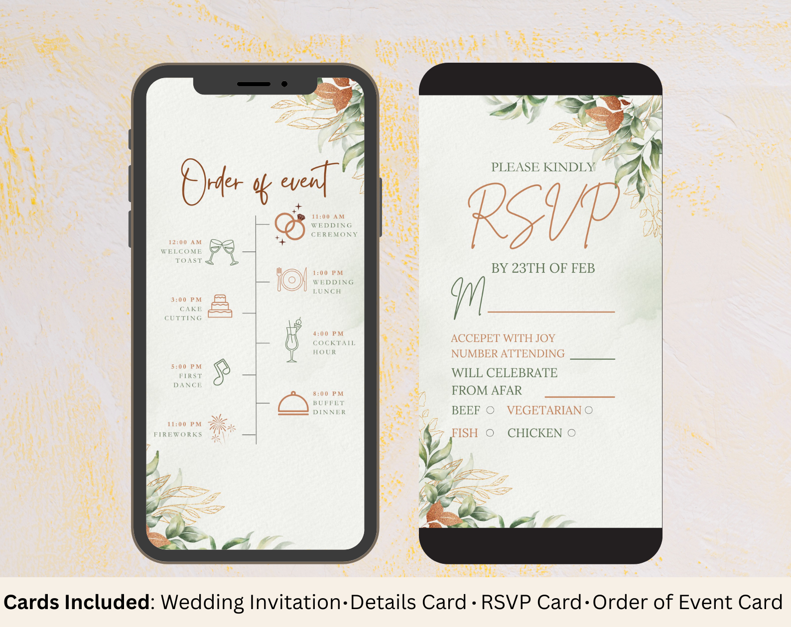 Invite your guests in timeless style with this Rustic Greenery and Gold Wedding Invitation. Designed with soft sage leaves, warm terracotta accents, and minimalist elegance, this digital wedding card is perfect for eco-conscious, modern couples who appreciate nature-inspired themes.